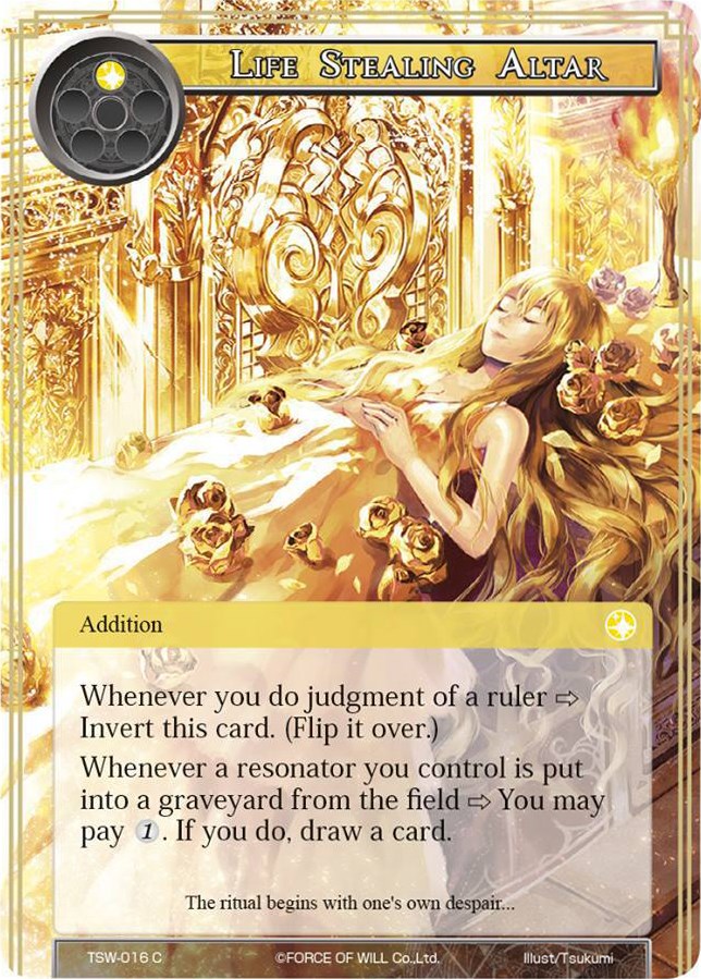 Life Stealing Altar Whenever you do judgment of a ruler -> Invert this card. (Flip it over.) Whenever a resonator you control is put into a graveyard from the field -> You may pay 1. If you do, draw a card. Soul Returning Altar When this card inverts -> Put the top card of your magic stone deck into the field rested. Banish a resonator: Target resonator gains [-400/-400] until end of turn.