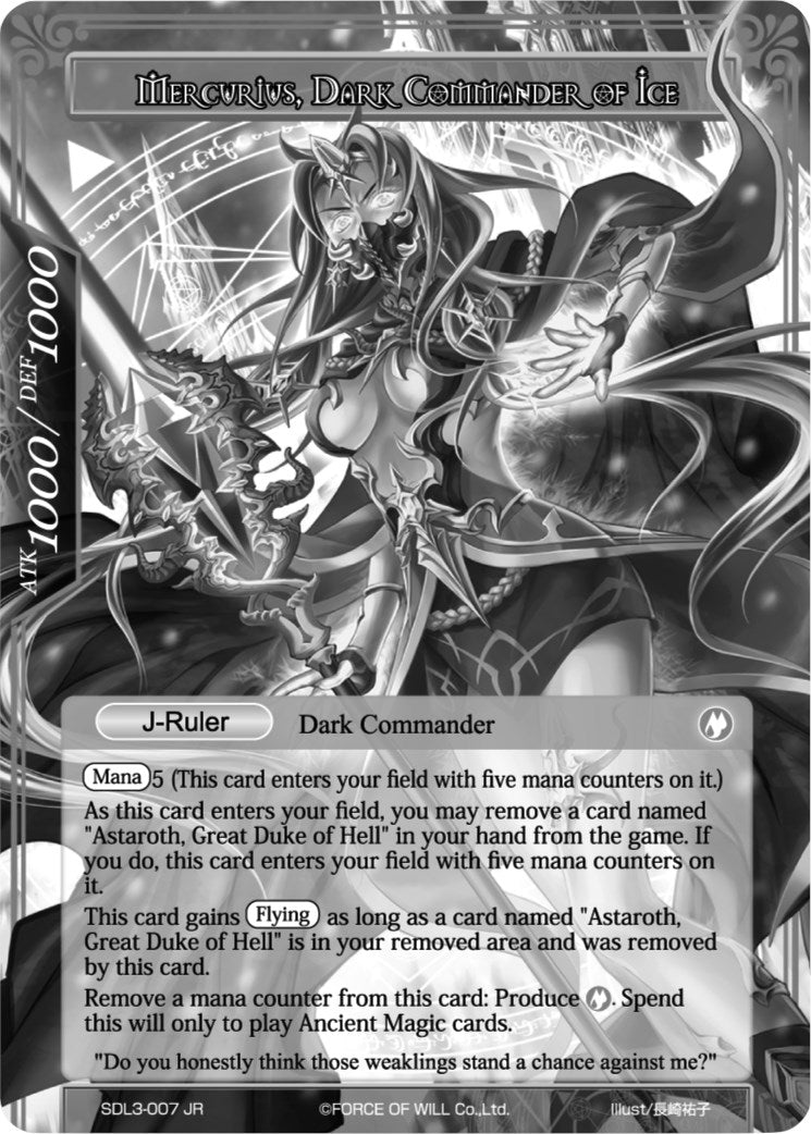 [Judgment] 1UU. [Energize] U (As the game starts, if you are not the player going first, you get a will coin with "Banish this coin: Produce U.") [Mana] 2 (As the game starts, put two mana counters on this card.) Remove a mana counter from this card: Product U. Spend this will only to play Ancient Magic cards. Mercurius, Dark Commander of Ice (J-ruler side) [Mana] 5 (This card enters your field with five mana counters on it.) As this card enters your field, you may remove a card named "Astaroth, Great Duke of Hell" in your hand from the game. If you do,this card enters your field with five mana counters on it. This card gains [Flying] as long as a card named "Astaroth, Great Duke of Hell" is in your removed area and was removed by this card. Remove a mana counter from this card : Product U. Spend this will only to play Ancient Magic cards.