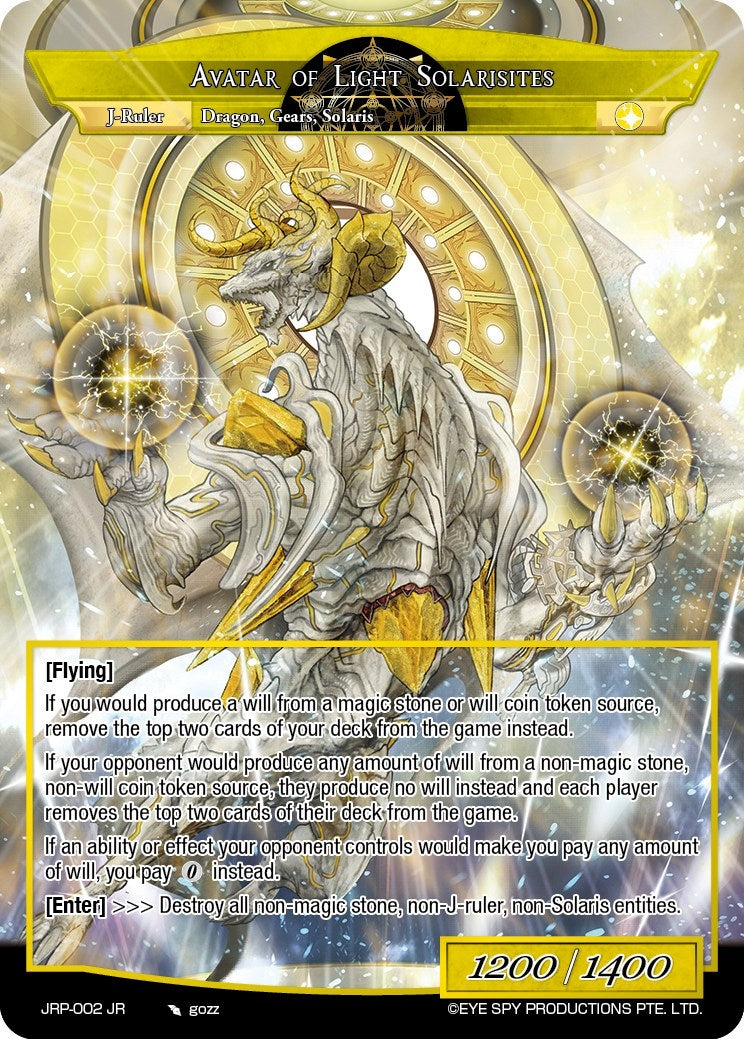 [Judgment] Put five non-magic stone light cards from your removed area on the bottom of your deck in any order. If you would produce a will from a magic stone or will coin token source, remove the top card of your deck from the game instead. If f your opponent would produce any amount of will from a non-magic stone, non-will coin token source, they produce no will instead and each player removes the top card of their deck from the game. If an ability or effect your opponent controls would make you pay any amount of will, you pay 0 instead. Avatar of Light Solarisites [Flying] If you would produce a will from a magic stone or will coin token source, remove the top two cards of your deck from the game instead. If your opponent would produce any amount of will from a non-magic stone, non-will coin token source, they produce no will instead and each player removes the top two cards of their deck from the game. If an ability or effect your opponent controls would make you pay any amount of will, you pay 0 instead. [Enter] Destroy all non-magic stone, non-J-ruler, non-Solaris entities.