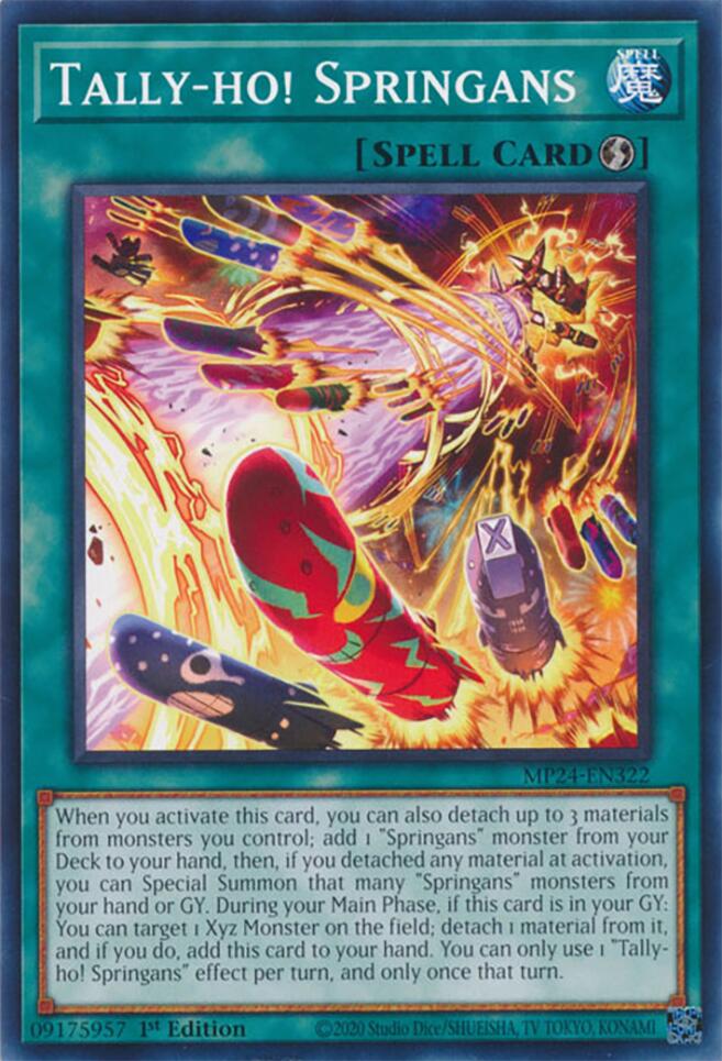 When you activate this card, you can also detach up to 3 materials from monsters you control; add 1 "Springans" monster from your Deck to your hand, then, if you detached any material at activation, you can Special Summon that many "Springans" monsters from your hand or GY. During your Main Phase, if this card is in your GY: You can target 1 Xyz Monster on the field; detach 1 material from it, and if you do, add this card to your hand. You can only use 1 "Tally-ho! Springans" effect per turn, and only once that turn.